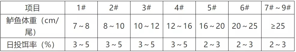 « 根据存池鲈鱼规格及数量,参考投饵参考表中推算投饵量,再根据天气、水温、水质、鲈鱼摄食及健康状况等予以适当调整。